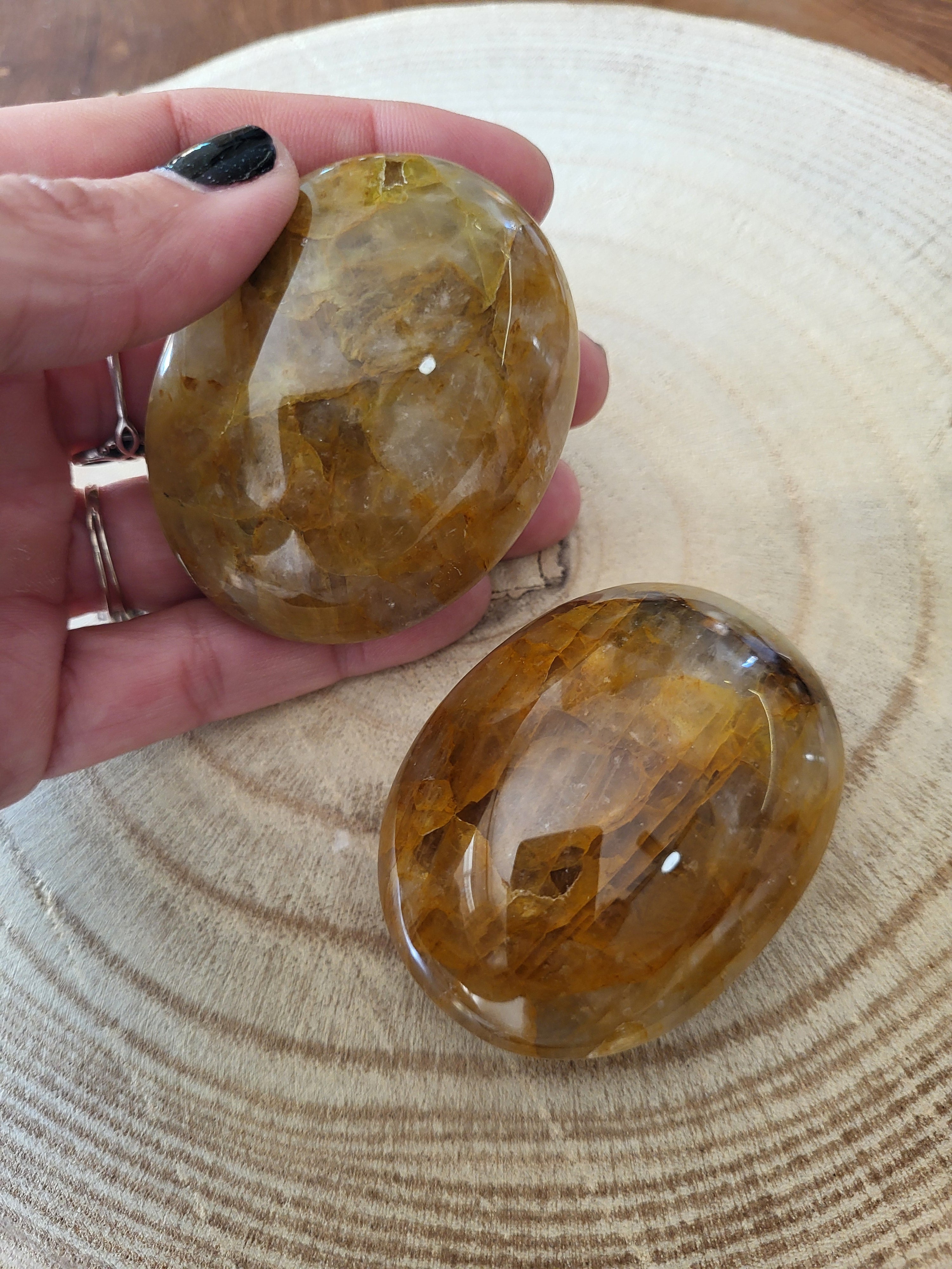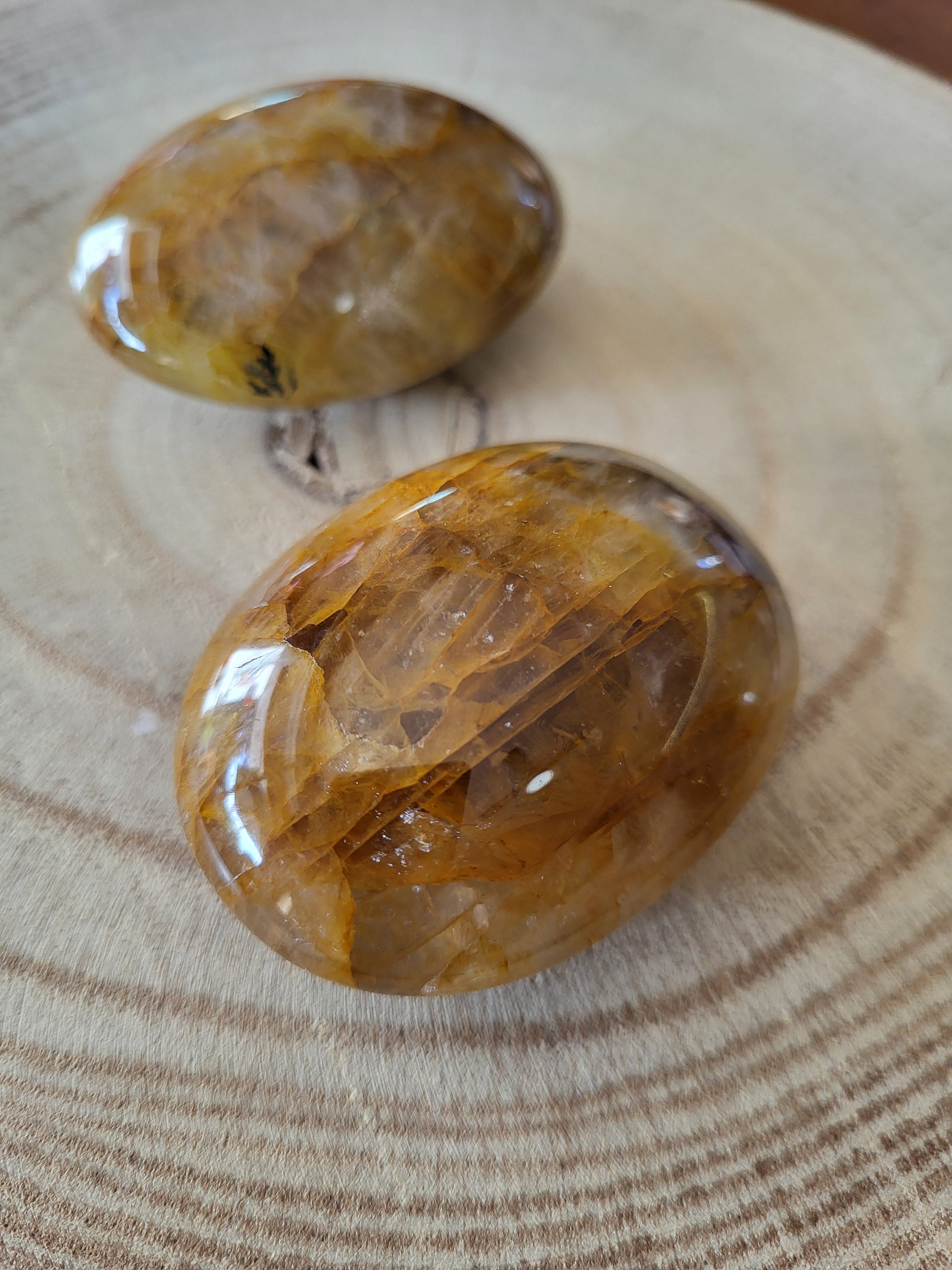 El cuarzo dorado, también conocido como cuarzo hematoide o cuarzo con inclusiones de hierro, destaca por su brillo cálido y su energía potente y envolvente. Este rodado es una pieza luminosa que conecta con la fuerza interior y la confianza en uno mismo.