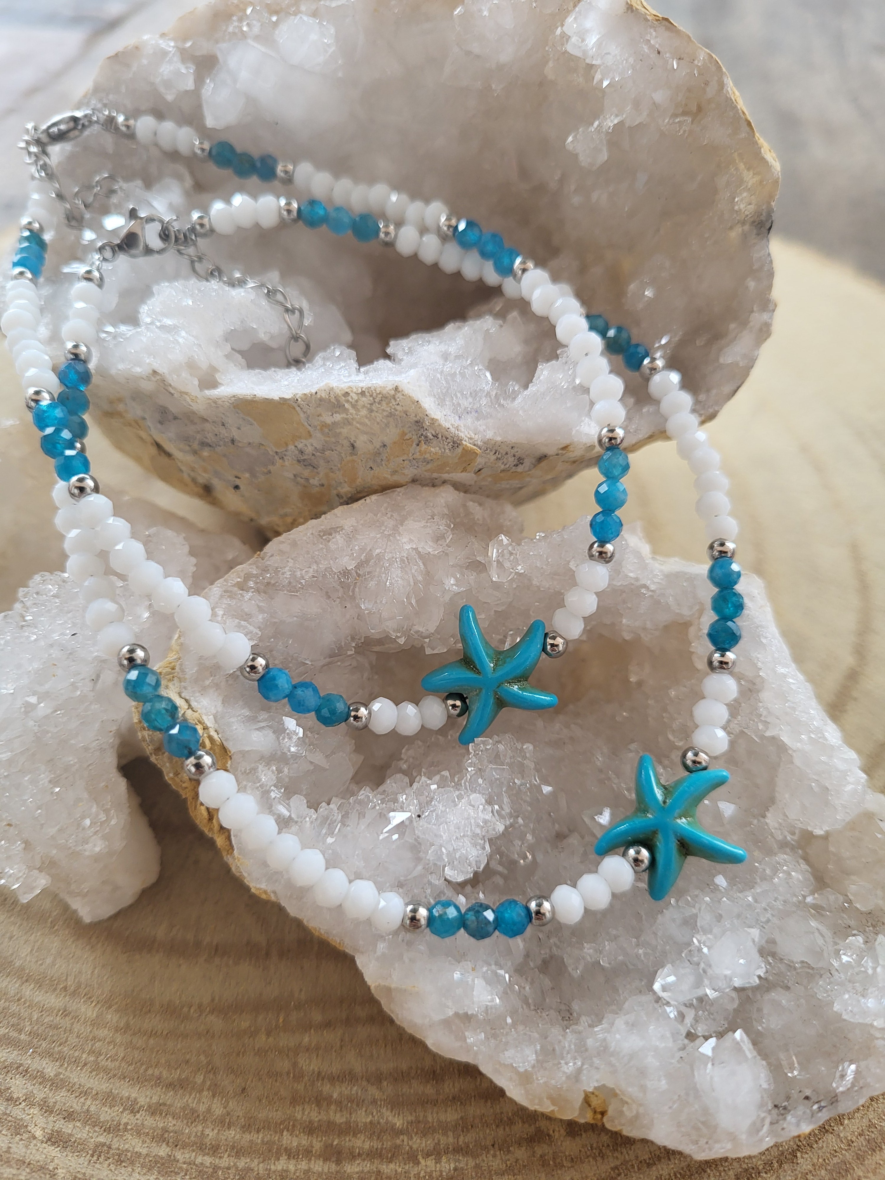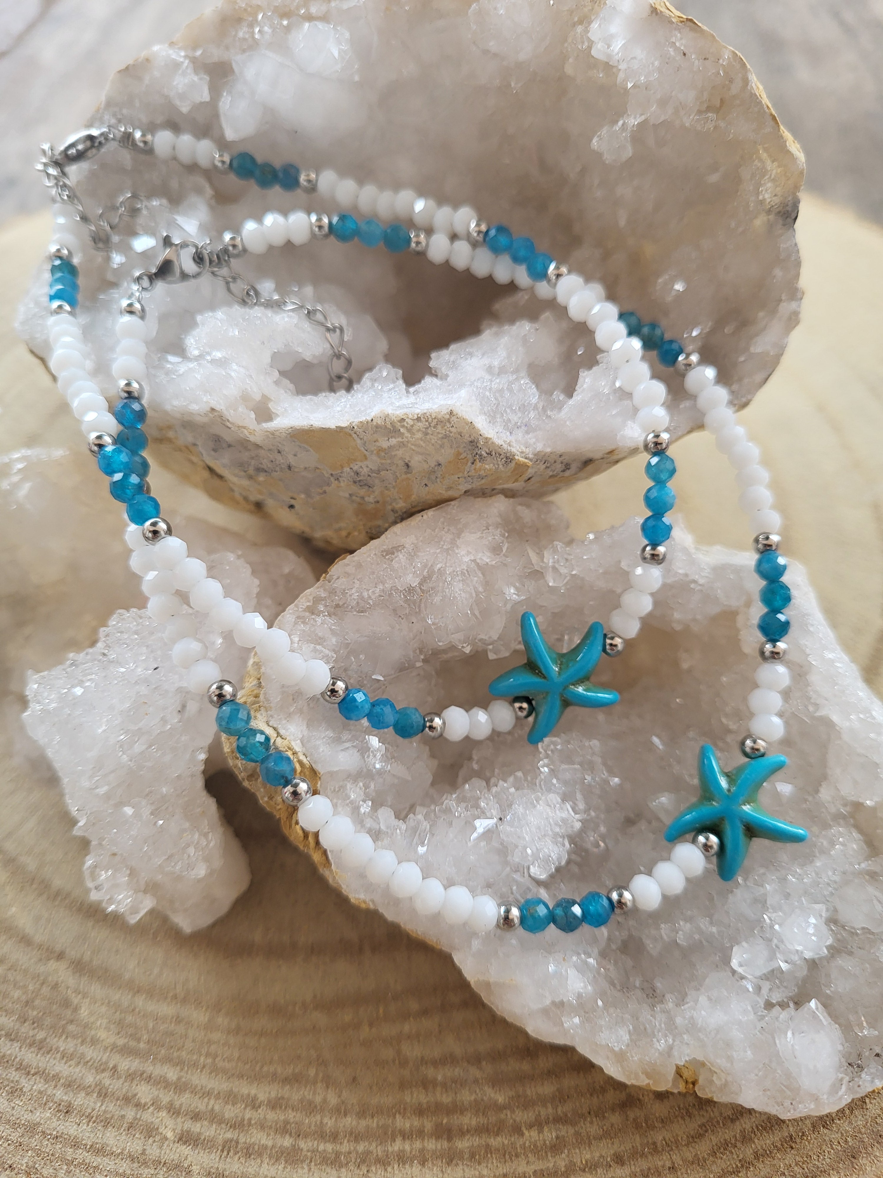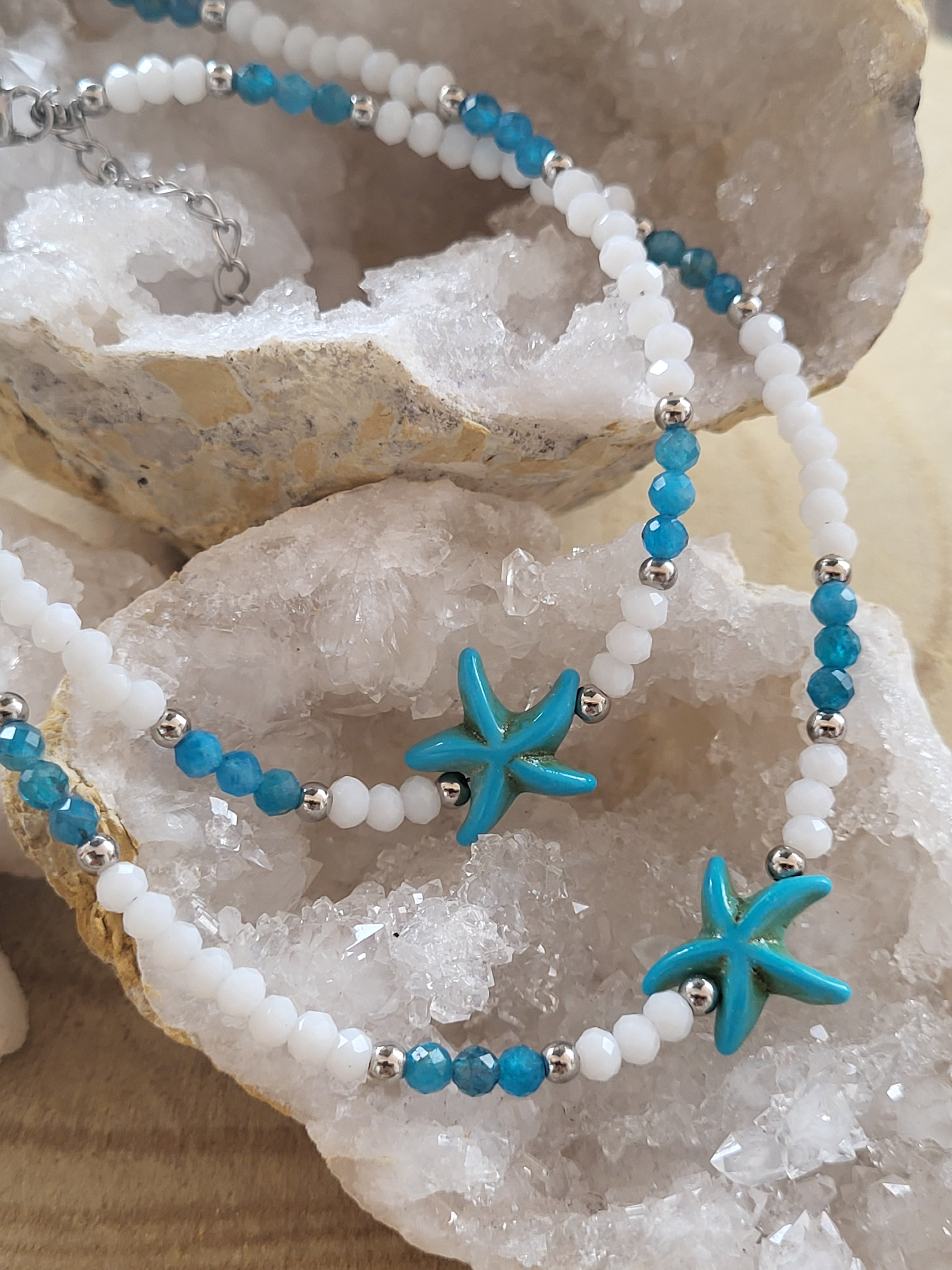 Juntos, el jade blanco y el apatito crean una sinergia energética única: mientras el jade aporta serenidad, equilibrio y pureza, el apatito despierta la inspiración, la creatividad y la fuerza interior. Esta combinación convierte a la tobillera en una pieza ideal para quienes buscan renovar su energía, conectar con su sabiduría interior y avanzar con claridad y propósito en su camino personal.
